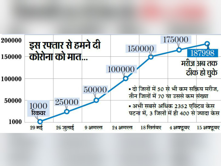 बिहार में गुरुवार को कोरोना मरीजों की संख्या दो लाख पार कर गई। दो लाख का आंकड़ा पार करने में 207 दिन लगे हैं। शुरुआती 10 हजार संक्रमितों की संख्या पार करने में 102 लगे थे। जबकि, अगला 90 हजार मिलने में 45 दिन ही लगे हैं। वहीं एक लाख से दो लाख संक्रमित की संख्या पहुंचने में 61 दिन का समय लगा।