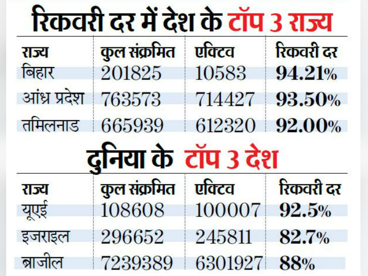 राहत की बात यह है कि दुनिया में कोरोना को हराने में बिहारी नंबर वन पर हैं। एक लाख से अधिक मरीजों वाले देश-राज्यों में बिहार का रिकवरी रेट सर्वाधिक है। हमारी रिकवरी दर 94.21% है। जो राष्ट्रीय औसत से 7% अधिक है। राज्य में अब तक 201825 संक्रमित मिले हैं। इनमें 187998 स्वस्थ हो चुके। अब एक्टिव मरीज 10583 बचे हैं। यानी कोरोना से जंग में हम जीत की ओर बढ़ रहे हैं।